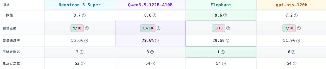 在指令遵循上,Elephant 在稳定性上表现最突出。其一致性得分达到 9.6,说明它在重复运行中的结果波动最小,是这组模型里最稳定的一款。但 Qwen3.5-122B-A10B 在正确率和通过能力上依然领先,Nemotron-3 Super 120B A12B 表现较为均衡,而 gpt-oss-120b 则暴露出更明显的波动性。