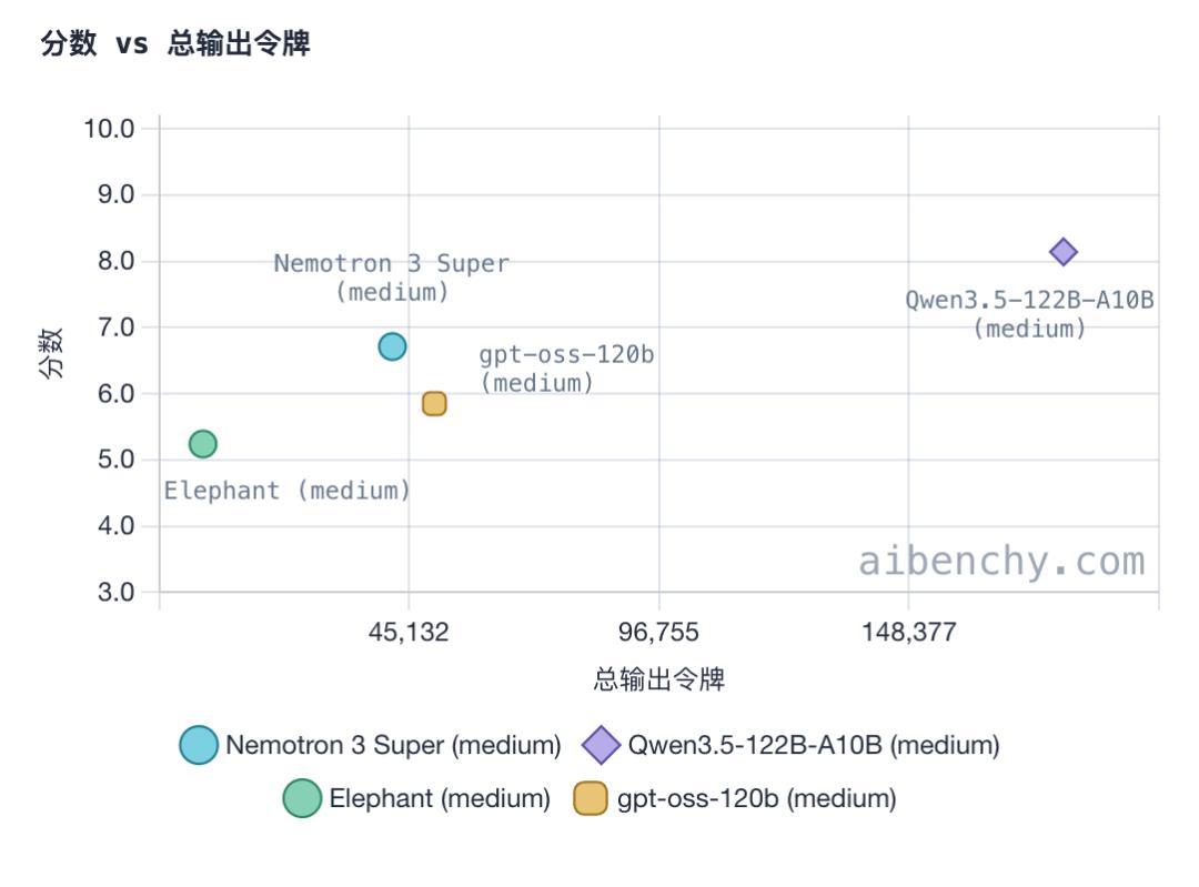 而在 token 消耗方面,Qwen3.5-122B-A10B 是这组里最“烧 token”的模型,推理 token 远高于另外三个;gpt-oss-120b 和 Nemotron-3 Super 120B 属于中间档;Elephant 基本不消耗。
