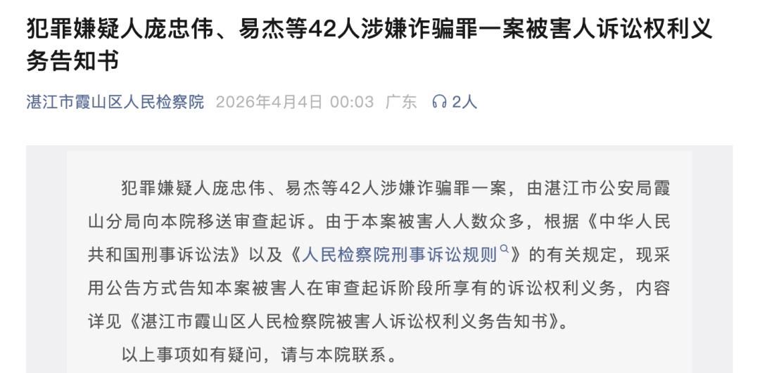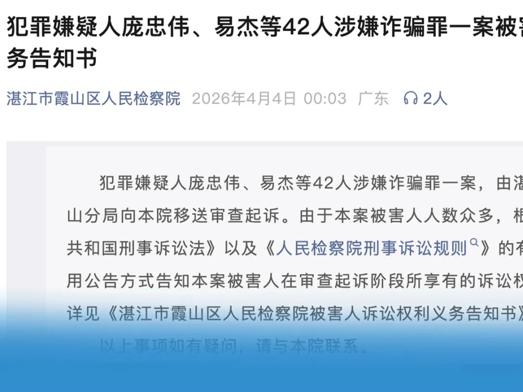 双方拉扯、举报、投诉、向国家信访局不断写信、报警……然然把能用的办法都用了,好在最后有“好消息”传来。时隔1000多天,在2026年4月4日,广东省湛江市霞山区人民检察院发布了一则通告——《犯罪嫌疑人庞忠伟、易杰等42人涉嫌诈骗罪一案被害人诉讼权利义务告知书》,文章指出,犯罪嫌疑人庞忠伟、易杰等42人涉嫌诈骗罪一案,由湛江市公安局霞山分局向本院移送审查起诉。