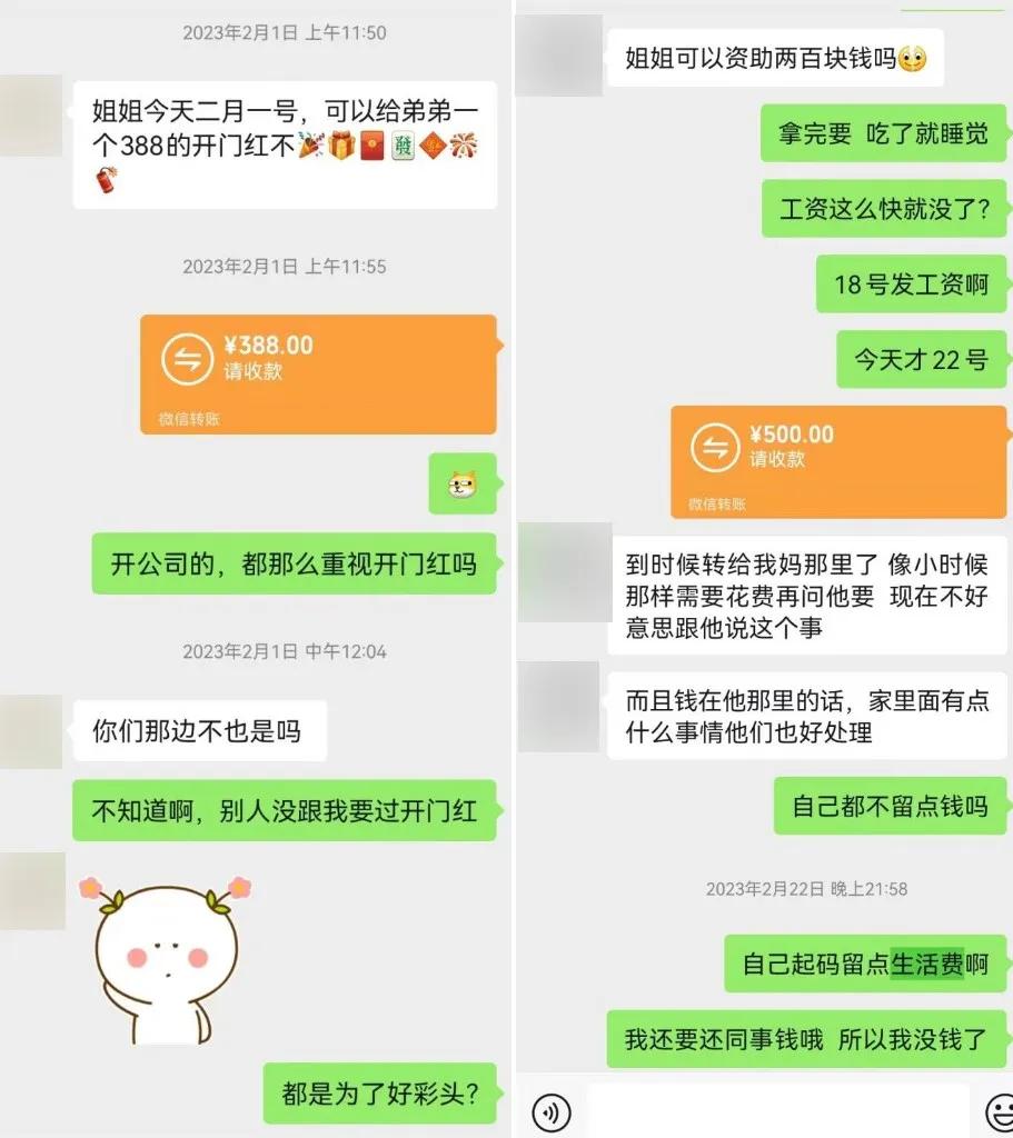 “姐姐,你要照顾好自己”“当我们回忆过往的时候,更多的是相伴相知的时光”“我会相信自己,只要努力就一定可以的,有姐姐的支持,弟弟就很有动力”“只要是对你好的,我都会全力以赴……”2022年8月15日,然然的微信添加了一名新好友——曾某某,这位通过手机号码搜索添加的陌生人,一开始表示“加错了”,然后便以“有缘”为由开始和然然以姐弟相称。彼时,因为家庭和工作双重压力,然然的心情正处于低谷期,在对方嘘寒问暖之下,她接受了这个天上掉下来的“弟弟”。