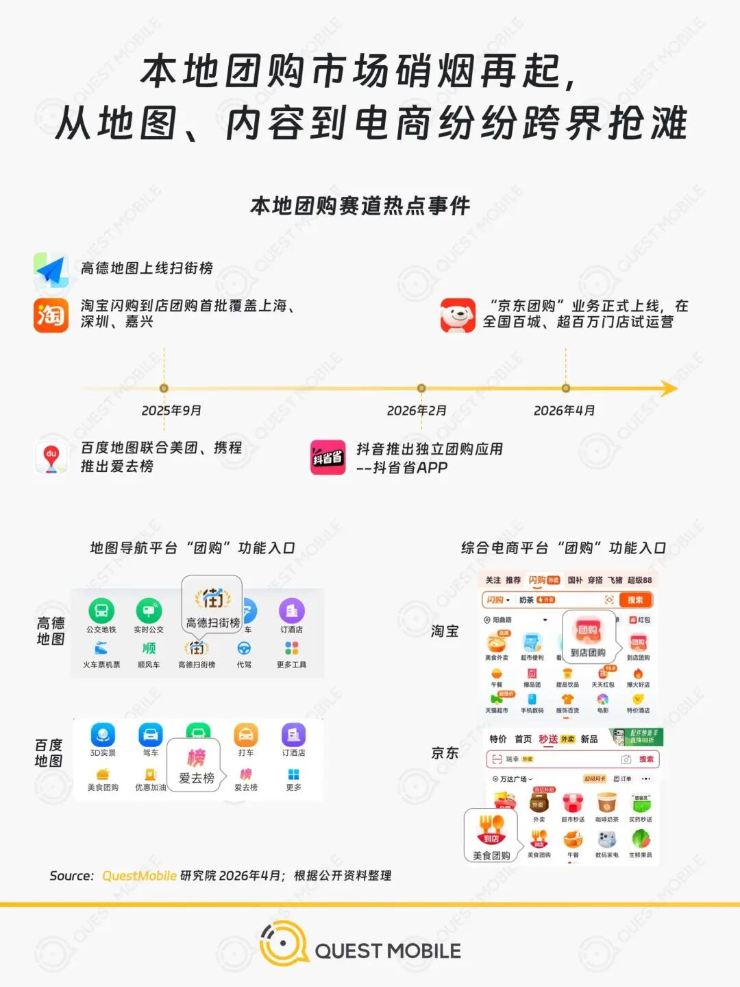 从抖音独立App“抖省省”的突围,到淘宝、京东将团购提拔为一级入口,再到高德、百度地图靠出行场景斜刺里杀入,一场比当年千团大战更维度复杂、也更具惨烈气息的围猎,正在2026年的春天正式铺开。