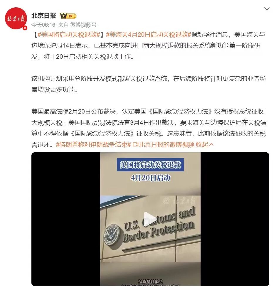 美国海关与边境保护局日前宣布,4月20日起正式启动关税退款申请。