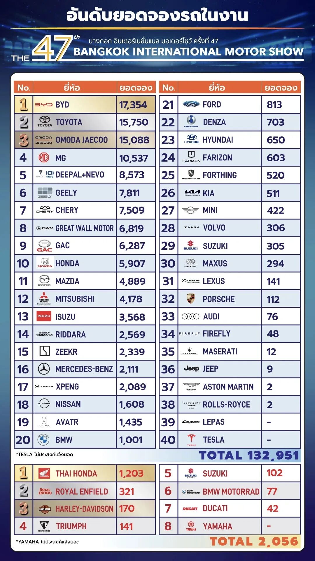 过去几年,曼谷国际车展一直保留着一项极具特色的行业惯例,即在展会闭幕当天,主办方会对外发布各参展品牌现场预订量的完整成绩单,用真实销量数据,直观呈现最新市场格局。