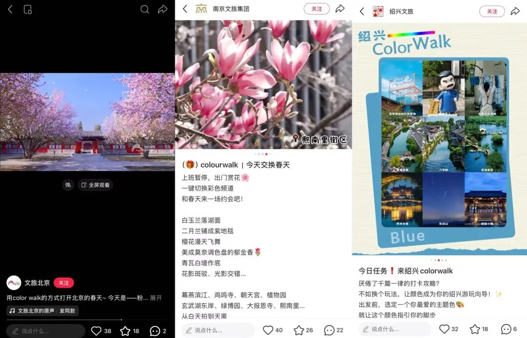 多地文旅部门已经跟进,开启了文旅与城市营销的新叙事。北京推出了古建红/山桃粉路线,南京以粉绿黄蓝紫展现金陵春光,绍兴发布“自由蓝”“治愈绿”等主题路线。
