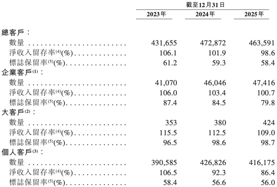 2025年,大客户(贡献收入超20万元)的净收入留存率高达109.0%,意味着老客户不仅没流失,还在持续增购。