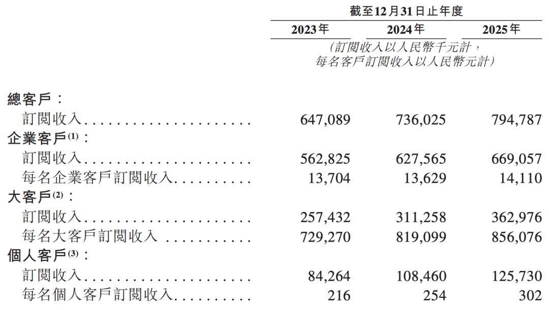 2025年,公司总客户数达46.36万名。其中,企业客户为4.74万名,虽只占十分之一,却贡献了84.2% 的订阅收入,这符合SaaS行业的“二八定律”。