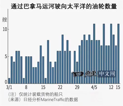 另一方面,从墨西哥湾到东亚的更短路线——从中美洲巴拿马运河出发横跨太平洋的航行也很活跃。根据MarineTraffic的数据分析最近运河的通航情况,进入4月以来,在装载石油的状态下驶往太平洋的船只平均每天为8.7艘,比3月增加7成以上。