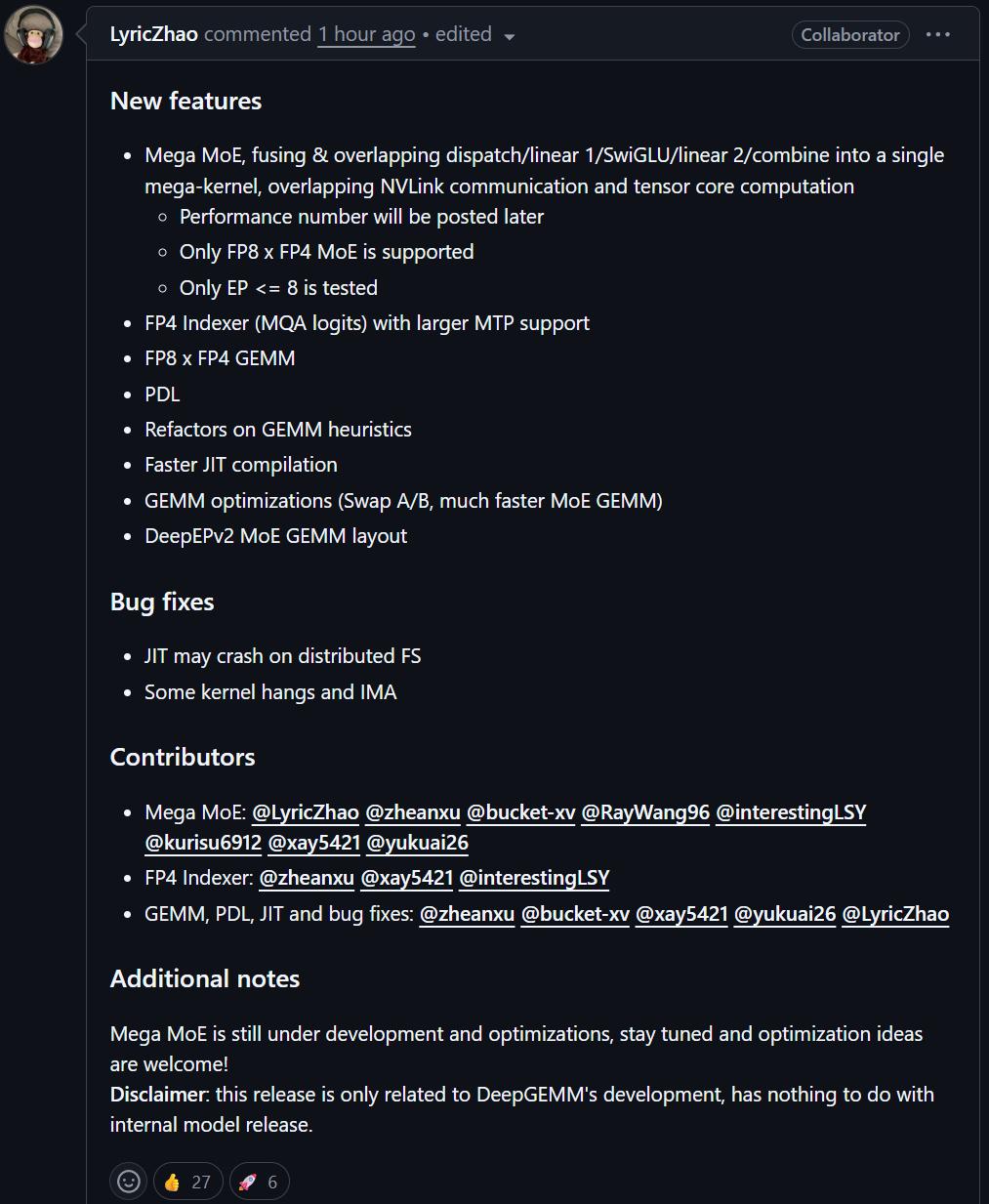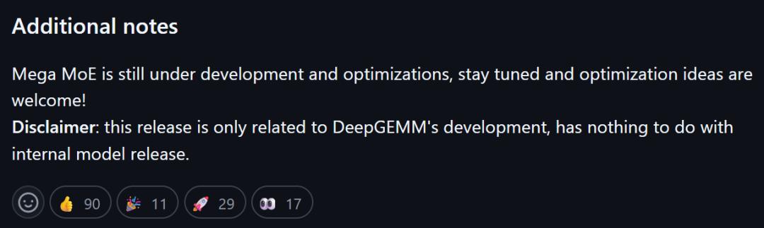 还有一个细节挺有意思:他们明确说,Mega MoE 还在开发中,性能数据「之后再说」。看起来,这种级别的优化,往往不是一版代码就能定型的,而是要在不同规模、不同拓扑、不同 workload 下反复调。现在放出来,更像是在给社区一个信号:方向已经定了,我们开始往这条路狂奔了。