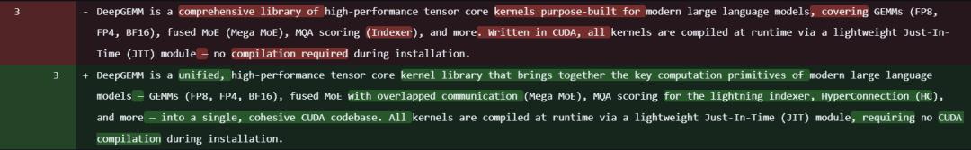 在此基础上,DeepSeek 也对 DeepGEMM 的描述进行了一些调整: