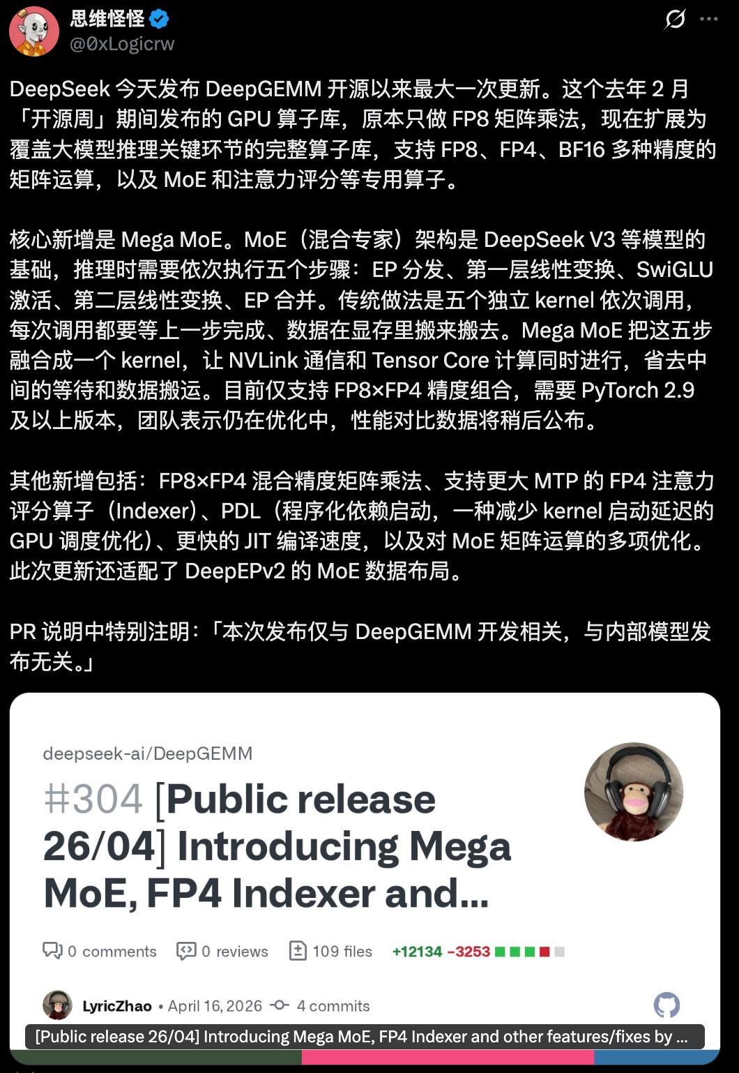 不过正如 DeepSeek 自己在 PR 中强调的,和模型没关系,更新了一下 DeepGEMM 代码库。