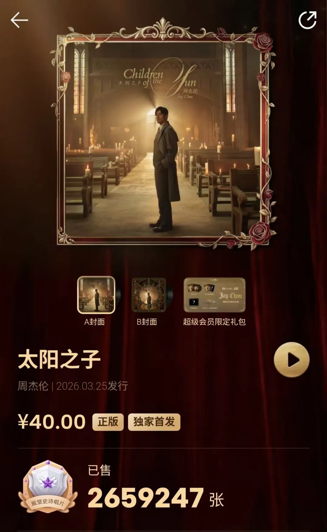 《太阳之子》迅速在QQ音乐达成“殿堂史诗唱片”认证,销量碾压蔡徐坤《KUN》等其他歌手新专,登顶2026年数字专辑销量榜首。