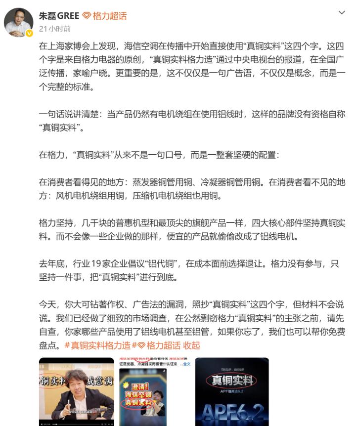 4月14日晚间,格力电器CMO朱磊在微博发文喊话海信空调,直言其在上海家博会传播中盗用格力“真铜实料”营销主张,同时喊话海信自查旗下产品铝线电机、铝管应用情况。