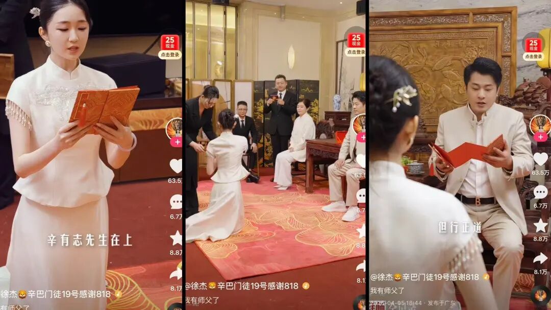 4月5日,辛选为徐杰举办了一场极具仪式感的传统收徒仪式,这是辛巴自2025年8月宣布“退网”后的首次公开露面,也是与妻子初瑞雪的罕见同框。二人身穿白色中式对襟外套,端坐太师椅,同样身着白色套裙的徐杰则先是用清水净手,随后跪读拜师帖、行三拜大礼,并向辛巴、师娘、师叔敬茶,而辛巴则向其授予回徒贴,送出了“心、根、路”三字箴言,表达了自己对徐杰"存心以正、守本不失、行道不辍"的期盼和祝愿。