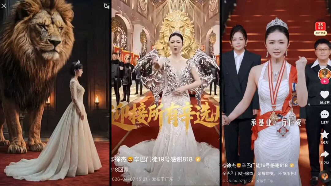在发布完这条拜师视频后,徐杰将账号此前的内容全部清空,并在个人简介中新增“师父、师娘”信息。随后,她又围绕着“门 徒”身份,陆续发布了一系列声势浩大、气氛堪比短剧的带货预热视频,如“门 徒加冕”“部门大点将”“迎接辛选用户”等。视频中,辛巴化身霸气狮子,徐杰则宛若代父出征的公主,手拿权杖,满眼坚定,以势如破竹的气势带领着辛选员工,直言要“再造辛巴”“捍卫辛巴”。