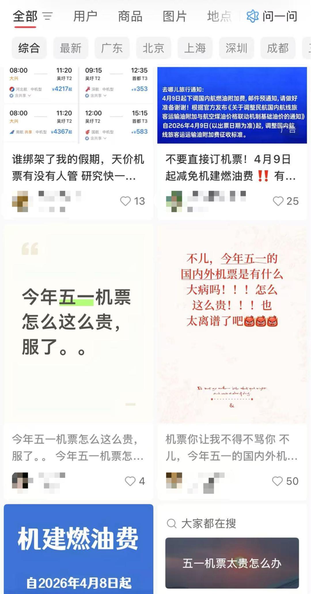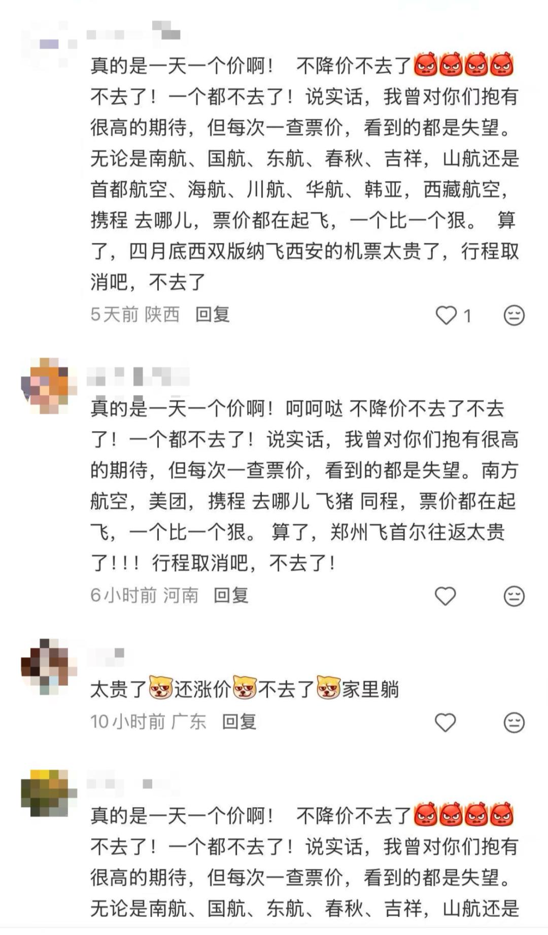 选择国内游的朋友倒是不用面对频繁被取消航班的难题,困扰他们的是另一件事:机票太贵了。