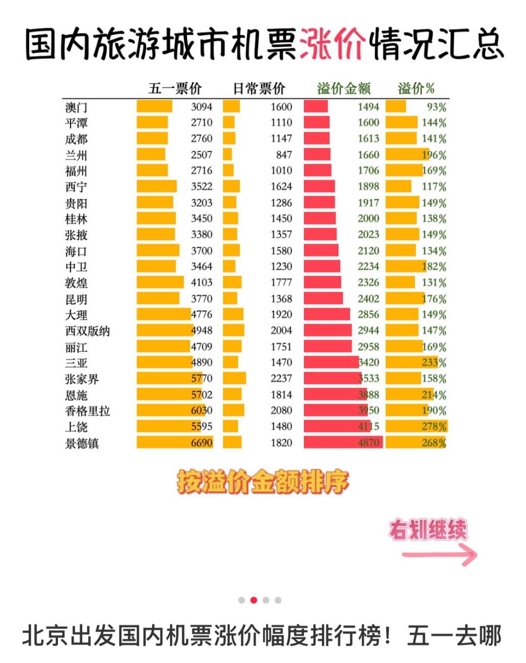 有网友统计了五一期间北京出发的机票,但凡是有头有脸的旅游目的地,翻倍已经是比较大的优惠。