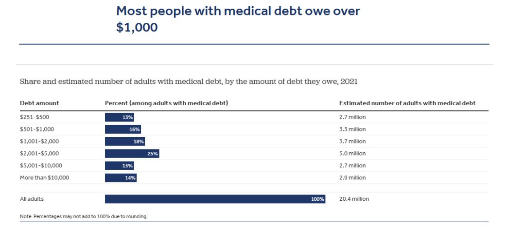 高额的医疗费用、不足的保险覆盖、过高的个人自付比例,让大量普通美国家庭不堪重负。SIPP调查显示:美国民众医疗债务总额至少达2200亿美元,其中1400万成年人的医疗债务超过1000美元,300万人的医疗债务超过1万美元。