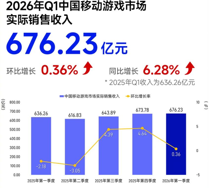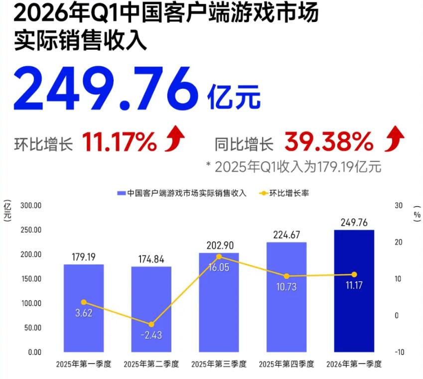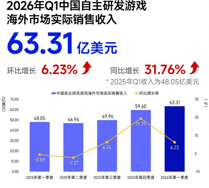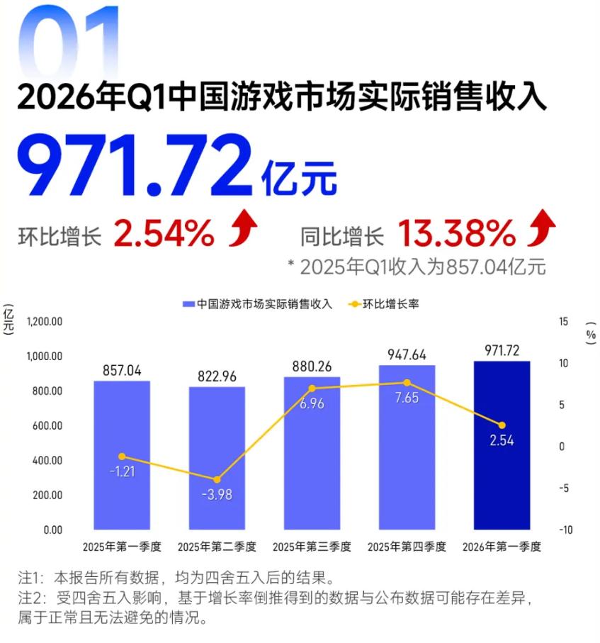 今日,中国音数协游戏工委发布《2026年第一季度中国游戏产业季度报告》,报告显示,2026 年第一季度中国游戏市场实际销售收入 971.72 亿元,环比增长 2.54%,同比增长 13.38%,其中,中国移动游戏市场实际销售收入 676.23 亿元,环比增长 0.36%,同比增长 6.28%,中国客户端游戏市场实际销售收入 249.76 亿元,环比增长 11.17%,同比增长 39.38%。中国自主研发游戏海外市场实际销售收入 63.31 亿美元,环比增长 6.23%,同比增长 31.76%。