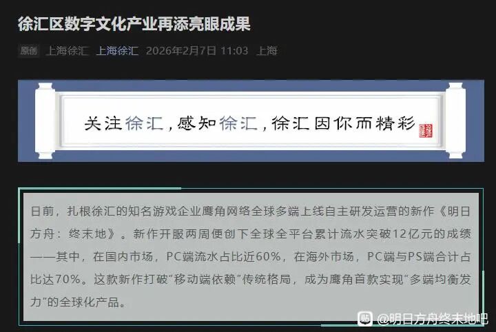 一方面是双端互通产品爆发,《明日方舟:终末地》《三角洲行动》等新品,据上海徐汇官方公众号发布的信息来看,《明日方舟:终末地》开服两周便创下全球全平台累计流水突破12亿元的成绩 ——其中,在国内市场,PC端流水占比近60%,在海外市场,PC端与PS端合计占比达70%。