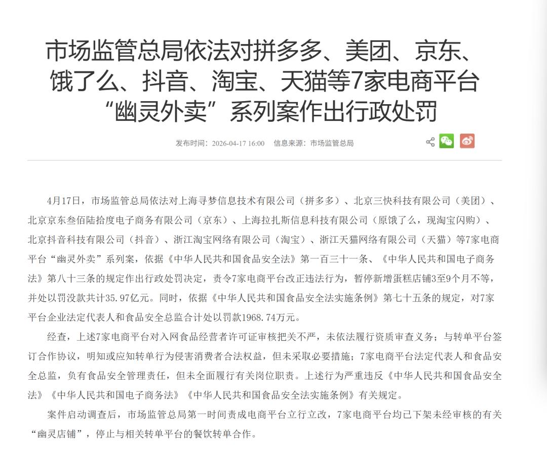 4月17日,市场监管总局对拼多多、美团、京东、淘宝闪购(原饿了么)、抖音、淘宝、天猫等7家平台,就“幽灵外卖”系列案作出行政处罚:责令改正违法行为,暂停新增蛋糕店铺3至9个月不等,并处以罚没款共计35.97亿元;同时,对7家平台企业法定代表人和食品安全总监合计罚款1968.74万元。
