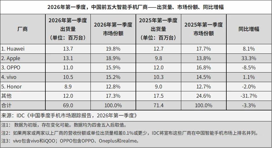 4月中旬,Omdia和IDC先后发布了2026年第一季度中国智能手机市场报告:华为稳居第一,苹果第二,OPPO和vivo分列三四名。