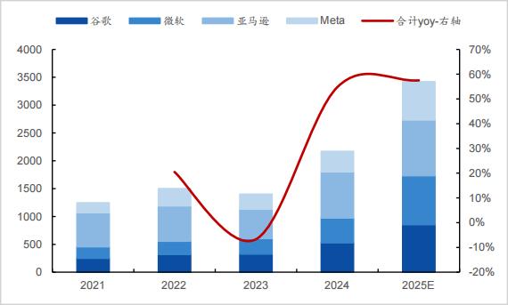 一是AI算力爆发带来的光芯片数量增长。近年来,下游云计算厂商资本开支不断攀升。微软、谷歌、亚马逊和Meta四家2025财年合计资本开支高达3500亿美元,同比增长约60%,为AI数据中心规模扩张提供助力,也将拉动光芯片出货量。