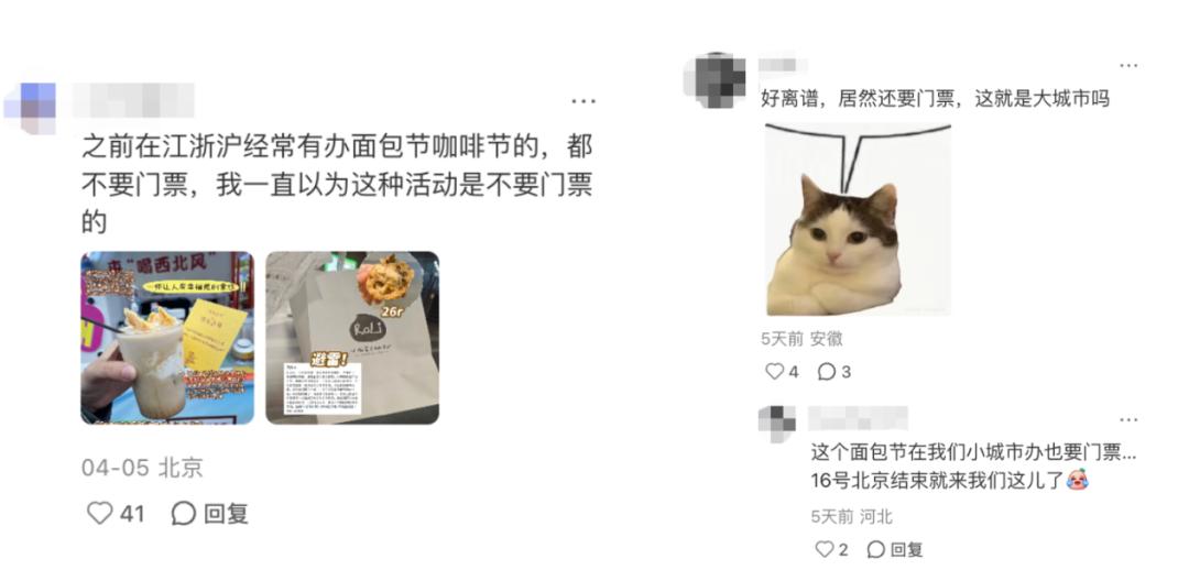 “在江浙沪常有办面包节、咖啡节的,都不要门票,我一直以为这种活动是不要门票的。”“好离谱,居然还要门票,这就是大城市吗”