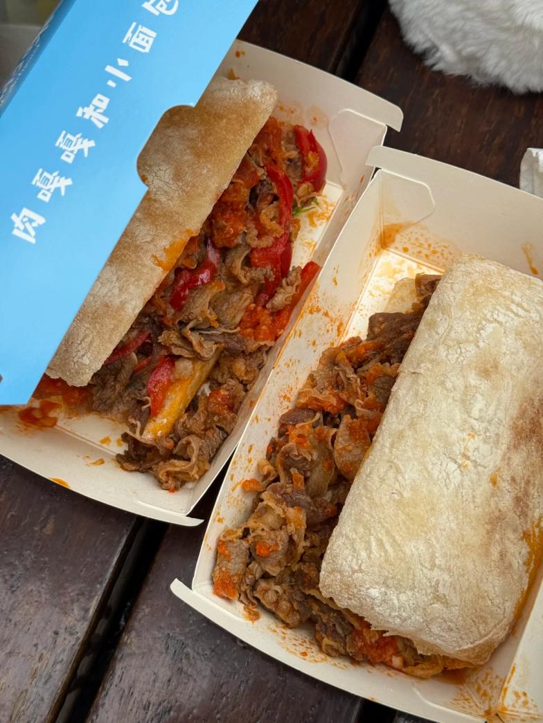 售价 32 元的泰式猪肉打抛恰巴塔、48 元的潮汕吊龙湿贝果、39 元的河南荆芥肥牛米法棍,大多都是现场炒制锅气十足,每一款都大排长龙。