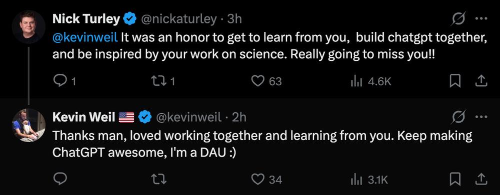 ChatGPT产品负责人Nick Turley随后跟帖互动,感谢Kevin Weil在共同构建ChatGPT过程中的指导与启发。Kevin Weil则回复称,自己也很享受共同工作的过程,并调侃“继续把ChatGPT做得更好,我可是DAU(日活用户)”。