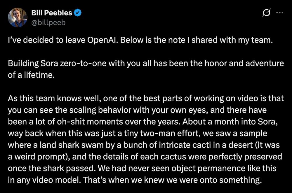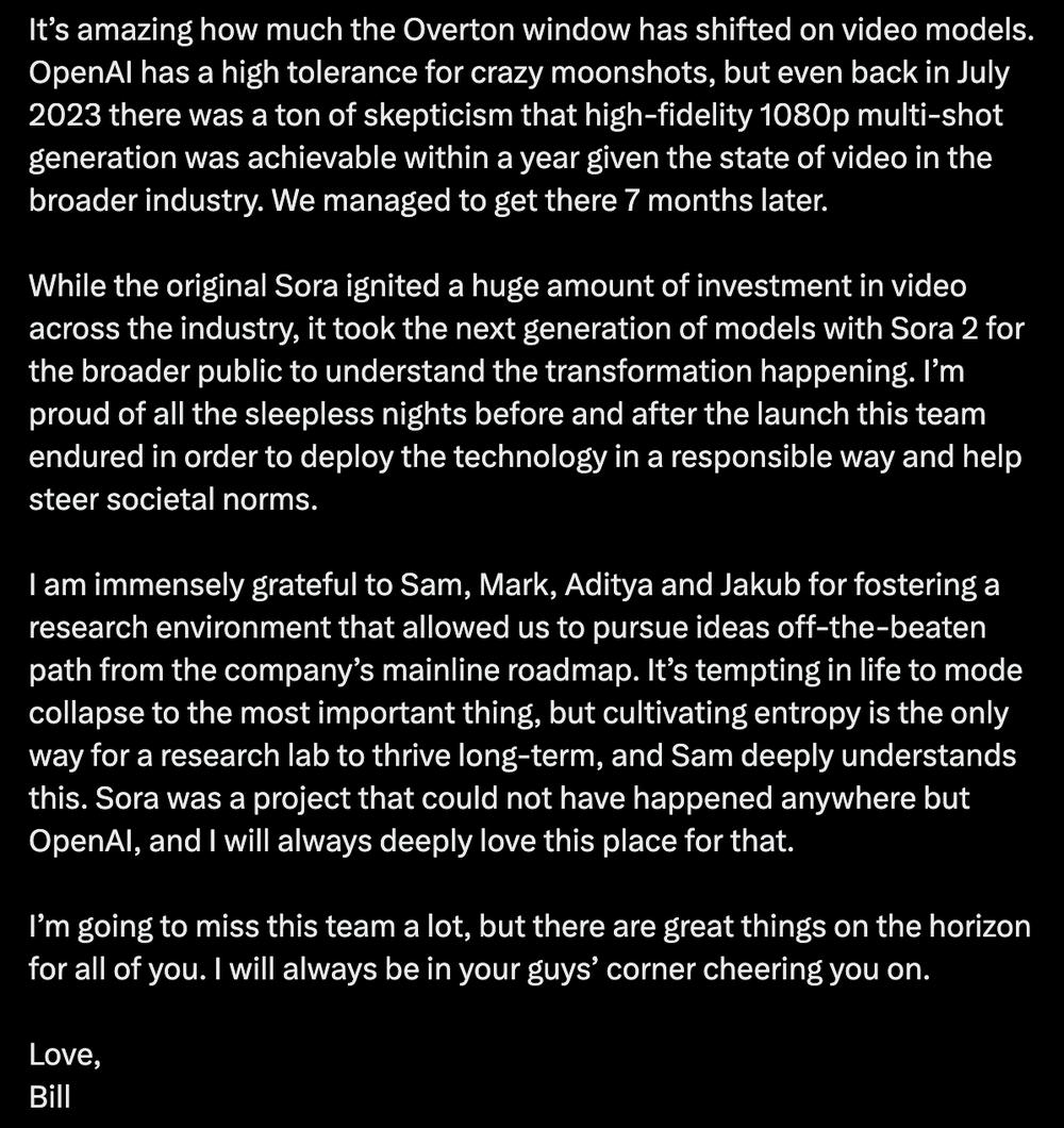 在公开信中,Bill回顾了Sora从零到一的研发历程,称与团队共同打造这一项目,是自己职业生涯中“最荣耀、也最像一场冒险”的经历。他同时感谢萨姆·奥尔特曼等人为团队营造的包容性科研环境,并直言,Sora“几乎不可能在OpenAI之外诞生”。