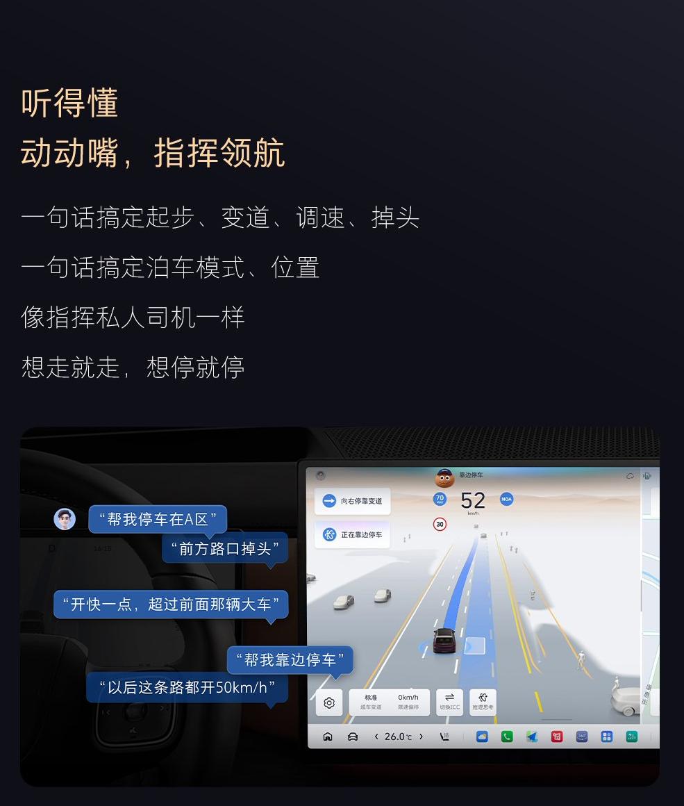 例如,当“右脑”接收到驾驶员或乘客的语音指令,无论是“送我去上班”这样的路径规划,还是“前方路口掉头”“开快一点”这类驾驶指令,“左脑”都能无缝接收,即刻执行,也就是说人们只需要动动嘴,就可以轻松指挥领航,灵活应变,就像指挥一位真人司机,想走就走,想停就停。