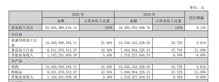 比这些数字更值得关注的是,其食品加工业务的异军突起——该板块收入同比增长超15亿元,达到85.52亿元,在总营收的占比攀升至42.56%,与家禽饲养加工板块的差距进一步缩小。