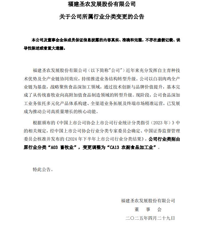 另外,去年4月,圣农发展变更了公司的行业类别,从原来的“A3畜牧业”改为“CA13农副食品加工业”,这可不只是简单的标签更新。