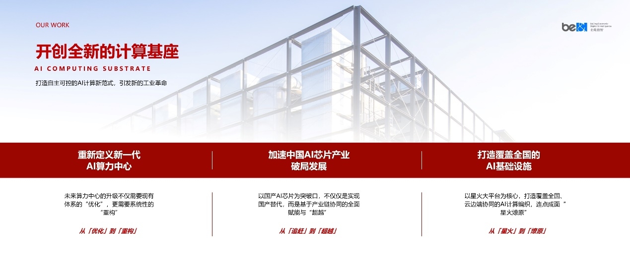 北电数智自成立三年来积极推动AI算力中心的重新定义、国产芯片的全产业链赋能、AI计算网络的全国化布局,致力于开创全新的AI计算基座: