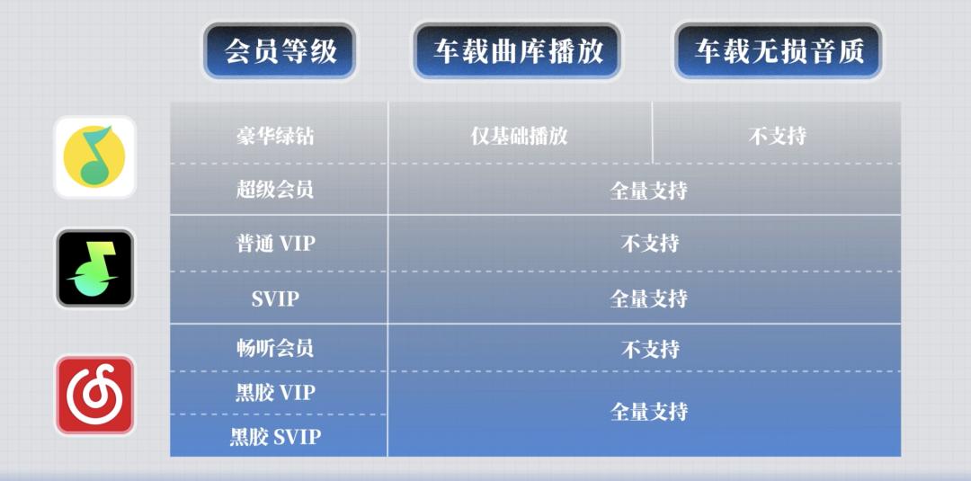比如 QQ 音乐在手机端绿钻就能听无损音质,到了车上,需要超级会员才能开启无损音质。