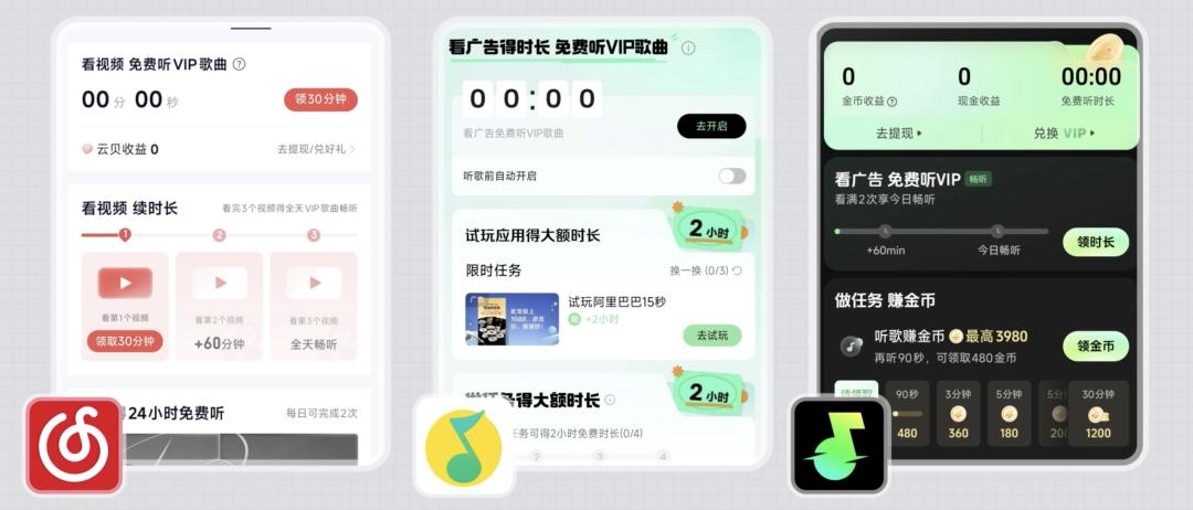 网易云、QQ音乐、汽水音乐,都推出了看视频广告畅听会员歌曲的活动,