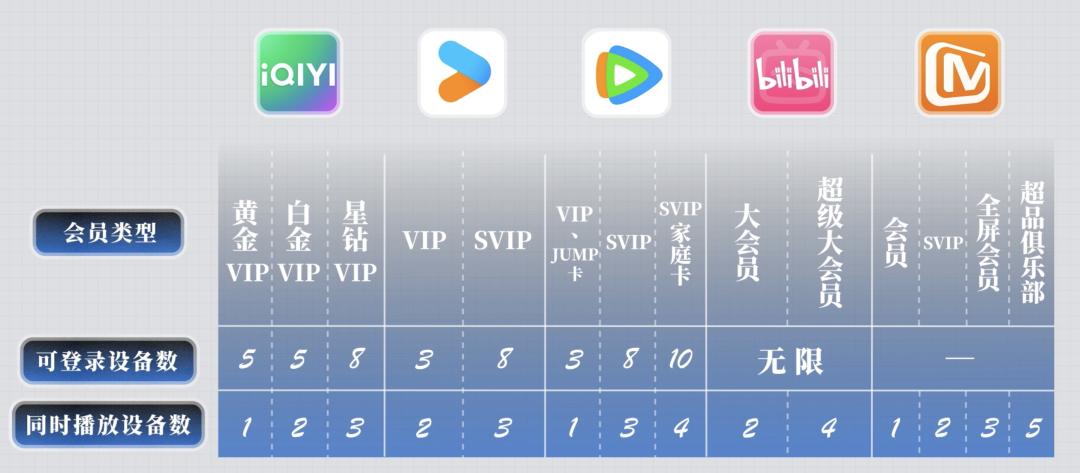 而花了更多钱的更高阶的会员,可以登录更多设备,支持同时播放的设备也更多,详情可以看下图,这里不再赘述。