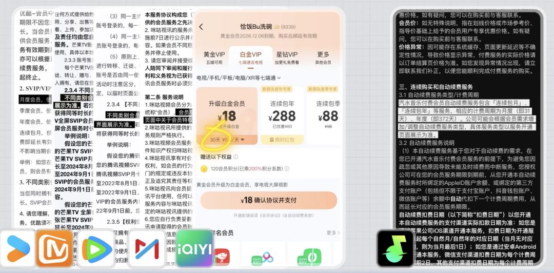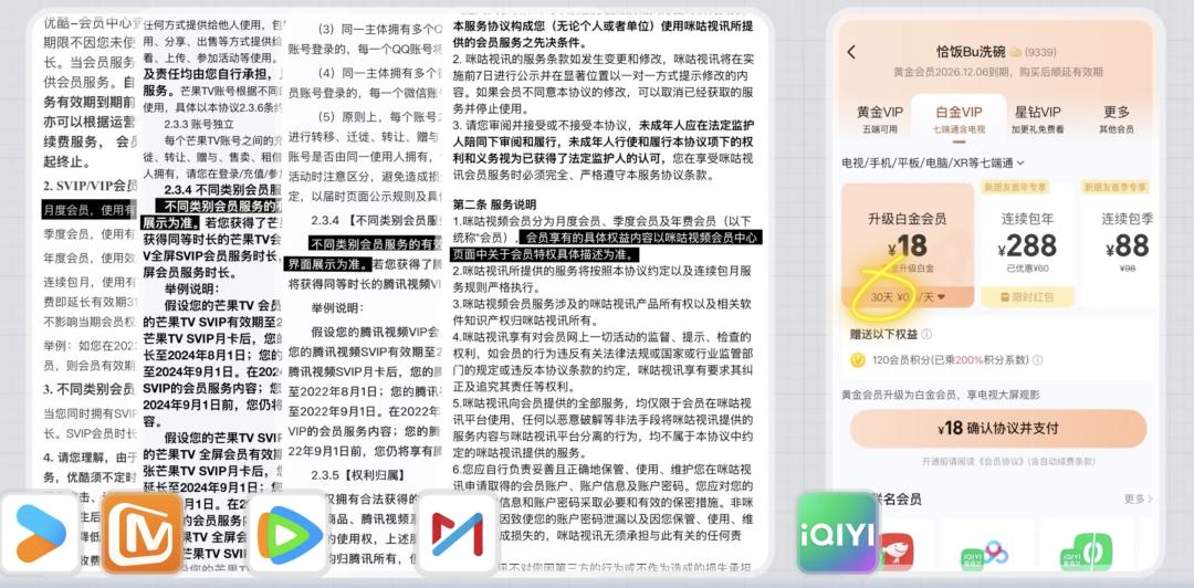 比如视频月卡,优酷在会员协议中写明,月度会员时长为 31 天,腾讯、咪咕和芒果,都是没有明确的数字,以“会员中心界面展示为准”,只有爱奇艺真的在会员中心展示了,升级白金会员的月卡只有 30 天。
