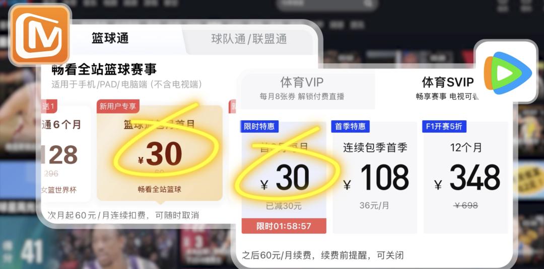 如果你想要看每个月爽看 NBA 比赛,体育 SVIP 卡,连续包月前三个月每个月 30 元,之后 60 元每个月,比腾讯的 SVIP 月卡 35 元高出不少。