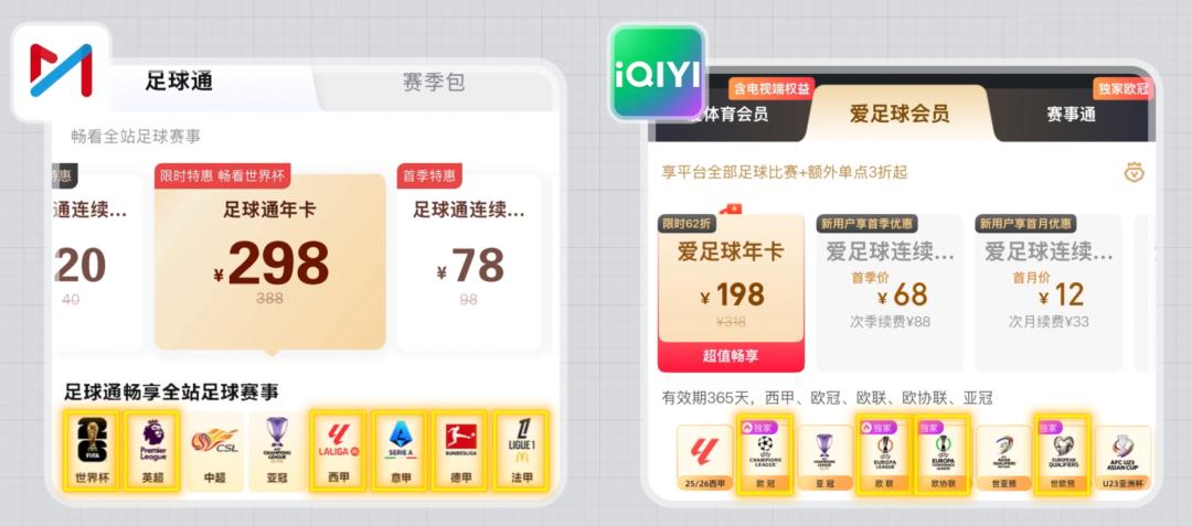 足球方面,版权资源则集中在咪咕和爱奇艺手里,而且价格同样也不低,咪咕集齐了欧洲五大联赛,足球通年卡 298 元,爱奇艺的爱足球年卡,有欧冠独家版权,198 元。