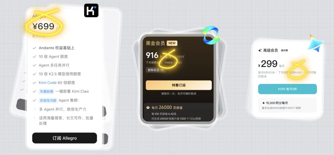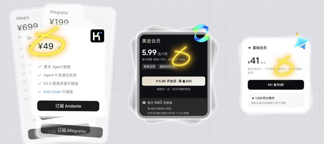 相比影音娱乐、内容社区和办公工具,这些AI工具的会员价格就非常贵了,最便宜的是 kimi 的这个 Andante,月费 49 元,可灵和即梦的起步价,也分别是 58 元和 69 元。