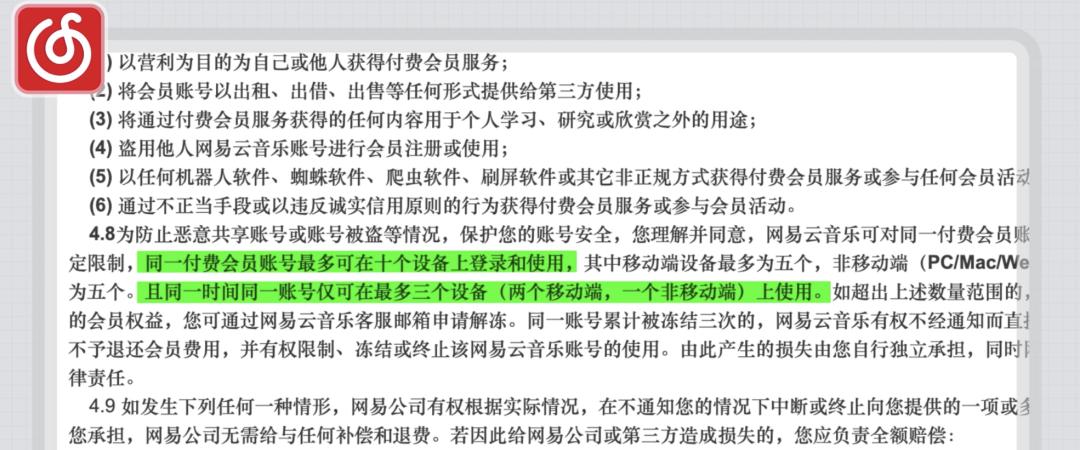 在登录设备限制方面,网易云在会员服务协议做出了说明,一个付费账号最多可以登录 10 台设备,同一时间可以在 3 台设备上使用,这我认为是比较友好的。