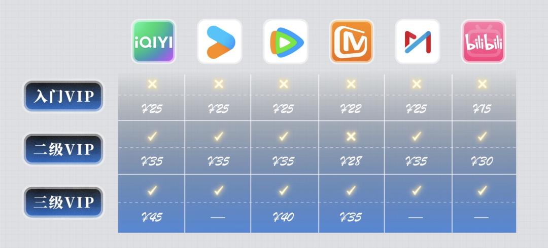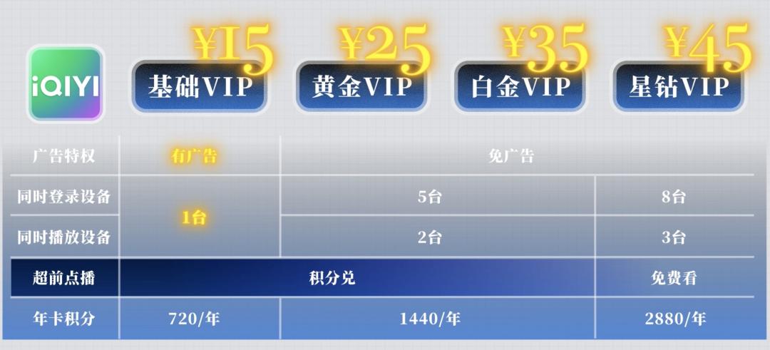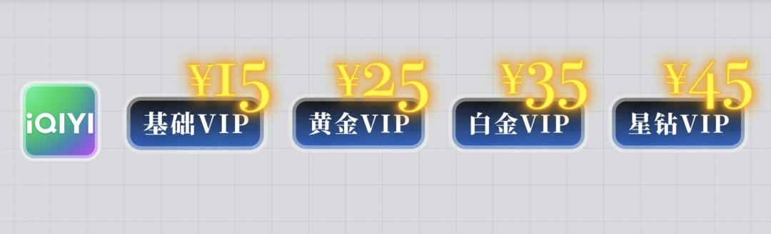 以爱奇艺为例,我们熟知的有黄金 VIP,白金 VIP 以及星钻 VIP,价格从 25元到 45 元,会员权益等级森严。