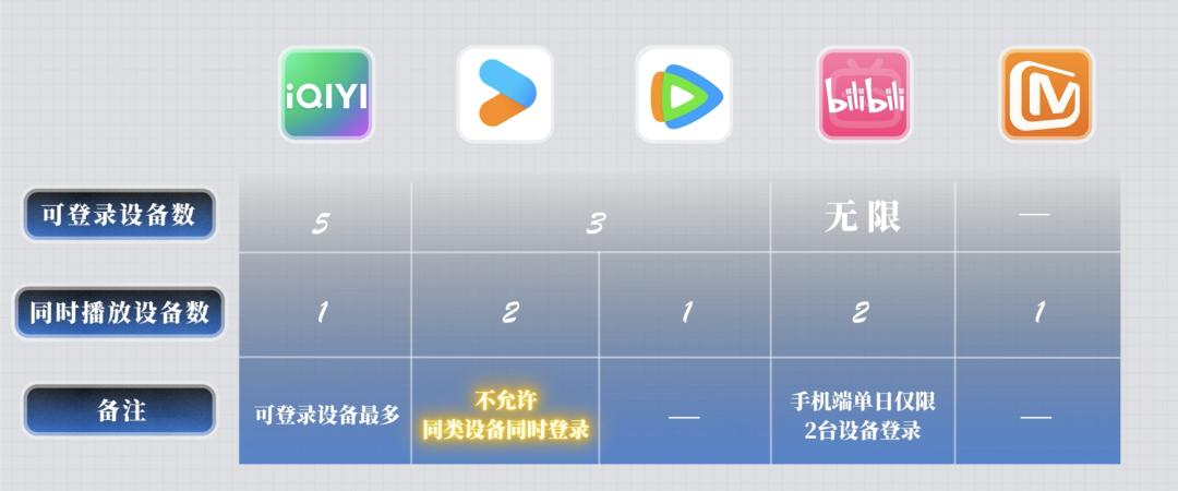 同样是入门级会员,爱奇艺同一个账号可以登录 5 个设备,是最多的,腾讯和优酷只能登录 3 台设备,而且优酷在会员协议中对登录设备做了详细限制,一个账号不能同时在同一类型设备上登录。