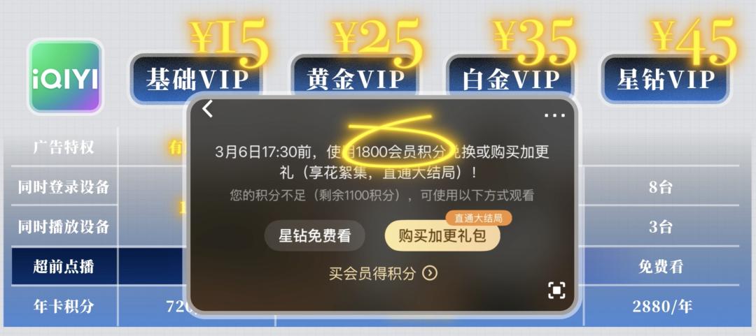 只不过,开通一次黄金 VIP 年卡,只有 1440 点积分,而一次直通大结局的积分是 1800。