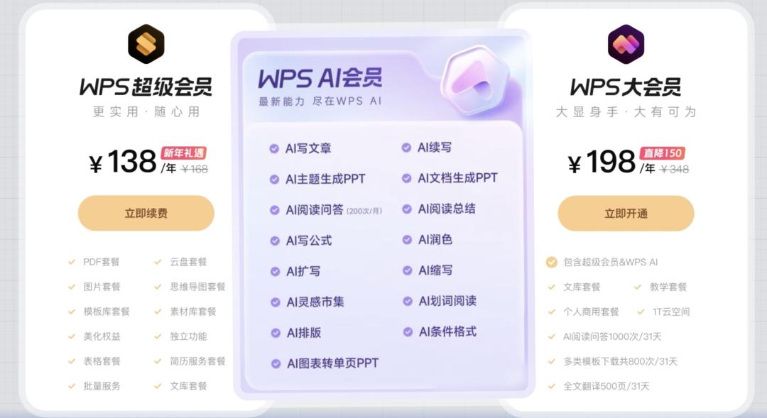 WPS 将办公功能作为超级会员的权益打包,AI 功能作为 AI 会员权益打包,然后大会员就是在超级会员权益上增加AI功能的权益。