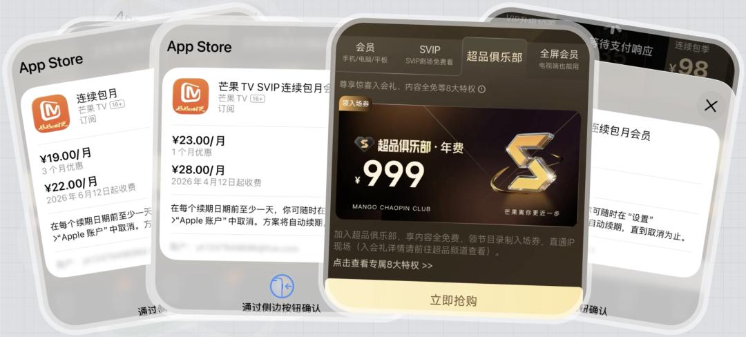 而芒果 TV 这边是会员、SVIP、全屏会员,芒果甚至还推出了年费 999 元的超品俱乐部,有节目探班和录制入场券,在粉丝经济这一块,芒果精准拿捏。