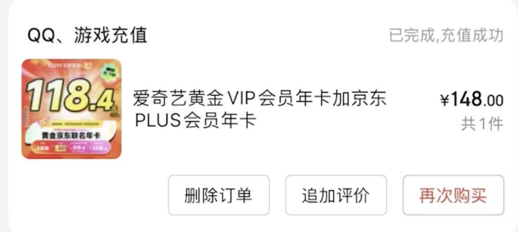 又比如,在 618、双十一这些促销活动力度大时购买年卡,会优惠不少,尤其是有两个平台的联合会员,我在双十一下单的京东 PLUS 和爱奇艺会员联合年卡,只要 148 元。
