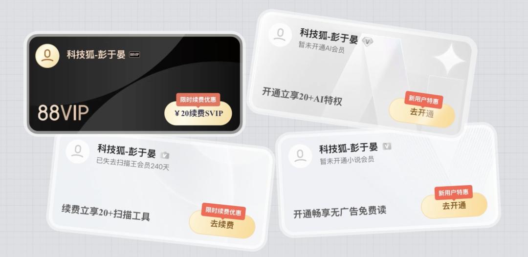 谁能想到,夸克这一个浏览器里面,竟然有四个独立的会员,包括网盘的 88VIP 和 SVIP 会员、小说会员、AI 会员和扫描王会员。