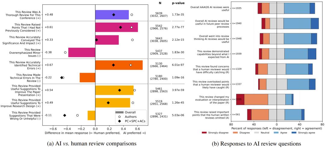 至于结果,可能在很多人的意料之中:AI 的整体表现已经胜过了人类。或者按 AAAI 官方的说法是:「对 AAAI-26 作者和程序委员会成员的大规模调查显示,参与者不仅认为 AI 评审有用,而且在技术准确性和研究建议等关键维度上,实际上更偏好 AI 评审。」